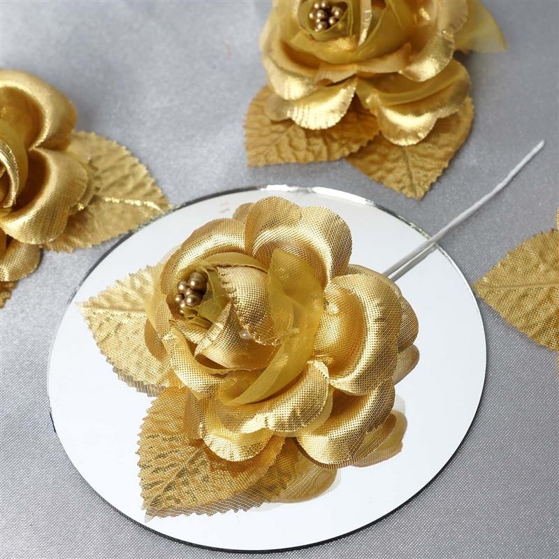 12pcs Gold Mini Satin Ribbon Rose Flower Pearl Spray Wedding Appliques Sewing Decor Craft Supplies