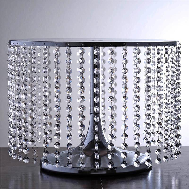 Add a big dose of glitz and glam to your cake or dessert table with our bejeweled chandelier crystal cake stand. Use this chandeliered metal and crystal adorned cake stand to sumptuously display your wedding cake or cupcakes. With the unrivaled grandeur and luxuriousness of chandeliers, this stunning accessory will evoke elegance and style. For a dazzling display, place mirrored vases, floating candle bowls, or chandelier candle holders around this server and see how enchantingly your ambiance will glow. Seamless luster of metal tray coupled with the twinkling glimmer of acrylic crystal chains make this cake server a true emblem of imperial sophistication. Coordinate this regal piece with our other crystal embellished accessories and decorations to create an entrancing ambiance.
