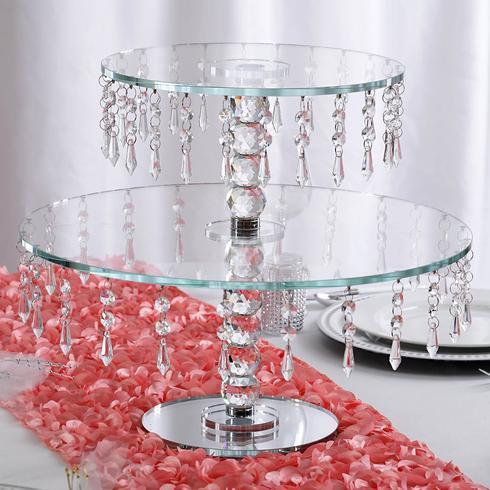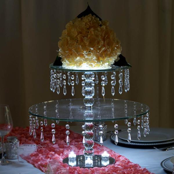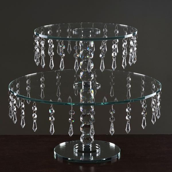 Flaunt your scrumptious and tastefully crafted party cakes, cupcakes, or pastries in the most sophisticated manner by displaying them on this classy clear crystal glass chandelier cake stand. Exuding pure glory and upscale quality, this tiered cake stand will enhance the temptation of your cakes, cupcakes, muffins, and other delicious treats. This highly elegant crystal glass cake stand is modishly been fashioned using two clear glass plates in classic circle shape supported by a stylish triangular cut prism stem with sparkling faceted spheres that reflect light like crazy in every direction, adding glitzy sheen to your merriment. With dazzling crystal beaded pendant strands hanging dreamily from the glass plates, this bling piece will be a focal point at your upcoming special event. Another attractive feature of this dazzling darling is that it is customizable! Yes! This means you can change its look according to your heart desires. Since crystal chains come unattached, you can now design and DIY your focal point of decoration anyway and every way you want. Either let them dangle and sway creating dancing silhouettes as the light is reflected and refracted by faceted crystals, or coil them in different lengths to add flair and fashion in your displays. With a beauty and class like this, it would be totally unfair to limit the use of this posh piece in displaying only bakery and dessert items. This would make a splendid riser for any centerpiece and it would be the perfect platform for any variety of candles, and candle holders. Classic circle shaped plates and bottom gives a swish look and feel to your dessert tables, gift tables, guest tables, or cake tables while sleek reflective glass base will further augment your overall decorations. Mystic multi-faceted crystal pendants will sparkle with impeccable clarity, giving your Cakes, Cupcakes, Candle or Centerpieces an exotic surreal look. Create an awe-inspiring Centerpiece or Cake Table Display by placing this lush luxury atop shimmer tulle or decorative mirror in circle shape with pearls, acrylic crystals, silk petals, and votive candles scattered around. Add an instant WOW factor by pairing this beauty with our other prism cut or crystal chandelier items, like Prism Cut Crystal Chandelier Candelabras, Crystal Prism Cut Candlesticks and Votive or Pillar Candle Holders, Crystal Vases, and so much more!