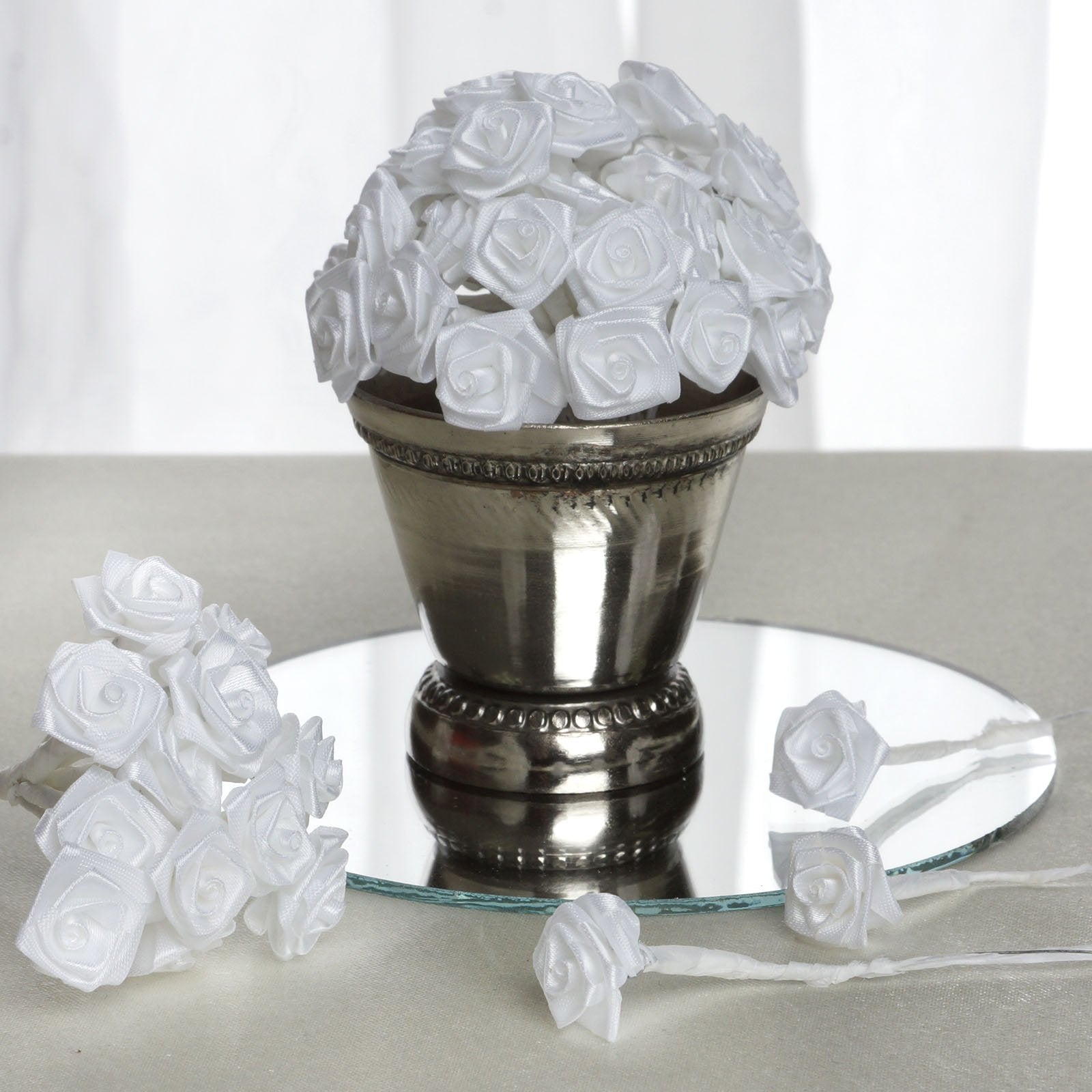 Soft, smooth and glistening satin ribbon is used to craft adorable roses on a 3 wired stem which is wrapped with the satin cloth to ensure maximum softness. These brilliantly hand rolled satin ribbon flowers are perfect to use in all varieties of crafting, favor making, gift adornments, party decoration and many other embellishing activities. Use these shiny tokens of love and beauty to add an instant visual element into your decorations and ambiance.